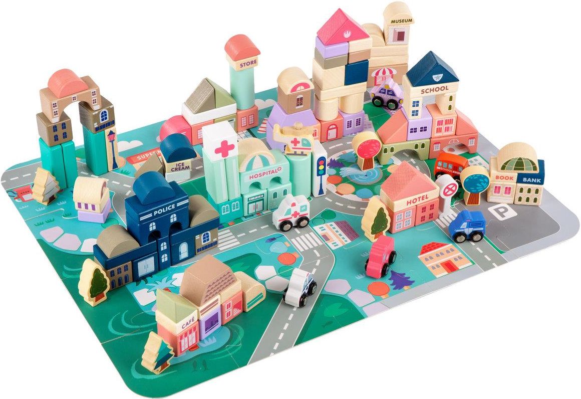 DREWNIANE KLOCKI EDUKACYJNE ZESTAW MIASTO Z ULICAMI 115 ELEMENTÓW + MATA PUZZLE Odkryj kreatywną zabawę z drewnianymi klockami „Miasto”! Zestaw 115 bezpiecznych elementów, mata puzzle do układania ulic, pojazdy oraz akcesoria wspierające rozwój i wyobraźnię dziecka. Bez ostrych krawędzi, pomalowane …