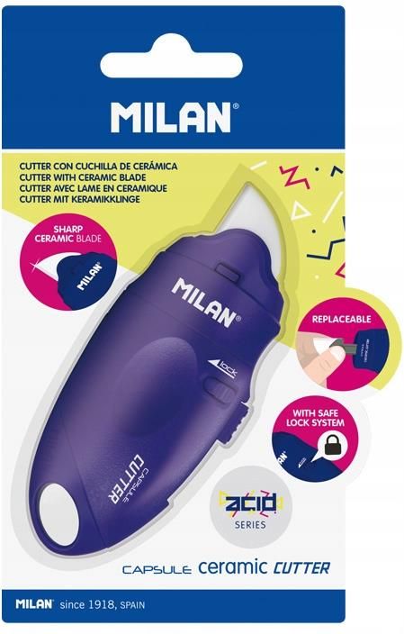 Nożyk ceramiczny CAPSULE ACID niebieski 1 szt. na Nożyk z wymiennym ostrzem ceramicznym. Kolekcja ACID. Kolor niebieski. Bezpieczny systemem wysuwu nożyka z blokadą. Ergonomiczny kształ i kieszonkowy rozmiar sprawiają, że idealnie nadaje się do rękodzieła w domu lub do użytku w biurach lub magazynach. Krótkie ceramiczne ostrze tnie różne rodzaje materiałów. Praktyczna dzuirka pozwala przywiesić nożyk. Dostępne zapasowe ostrze: kod BWM10338. Oryginalny produkt stworzony przez własny dział badawczo-rozwojowy MILAN. Rozmiar nożyka: 10,8 x 4,5 x 1,7 cm.