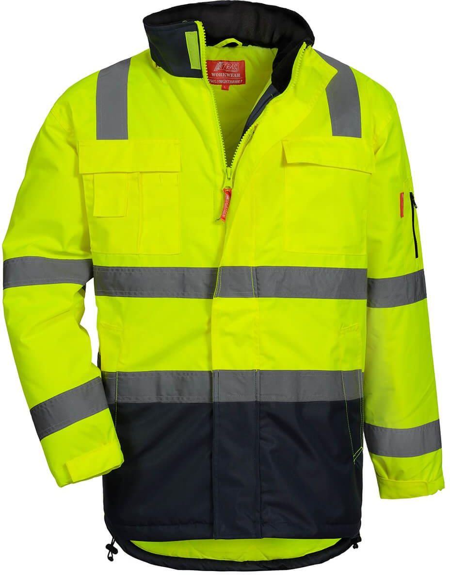 Kurtka robocza odblaskowa Nitras Motion Tex Viz 7145 w kolorze neonowym żółtym/granatowym, z elementami odblaskowymi zwiększającymi widoczność w trudnych warunkach pogodowych i oświetleniowych. Wykonana z wysokogatunkowego materiału Oxford Poliester o właściwościach wodoodpornych, co zapewnia ochronę przed wilgocią i deszczem. Kurtka robocza Nitras 7145 wyposażona jest w kieszenie na klatce piersiowej z zaczepem na etui/dowód osobisty, dwie kieszenie boczne, kieszeń na telefon, kieszeń na rękawie oraz kieszeń wewnętrzną, co gwarantuje przechowywanie narzędzi, akcesoriów i dokumentów w zasięgu ręki. Dodatkowo kurtka posiada rolowany kaptur, chowany w kołnierzu. Istnieje możliwość dokupienia odpinanego, ocieplanego kaptura Nitras 7141K w kolorze kurtki. Właściwości produktu Elementy odblaskowe Właściwości wodoodporne Duża ilość kieszeni Rolowany kaptur chowany w kołnierzu Zastosowanie Przemysł transportowy Prace budowlane Przemysł logistyczny Lotniska Prace drogowe Prace na zewnątrz w trudnych warunkach pogodowych Materiał wierzchni: 100% Oxford Poliester Podszewka: 100% Poliester Dostępne rozmiary: XS – 4XL Opakowanie zbiorcze: 10 sztuk w kartonie Normy i certyfikaty: EN ISO 20471 | EN 343