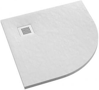 Nr kat.3.3104/B/ST-M2 Długość 90cm Szerokość 90cm Promień R55cm Wysokość 3,5cm Głębokość spad do 2% Kształt: półokrągły Materiał: kompozyt Stonicryl® Kolor: biały struktura kamienia RAL 9003 Sposób montażu: w posadzce, na posadzce Średnica odpływu: 90mm Gwarancja: 15lat Brodziki Kalait od Schedpol …