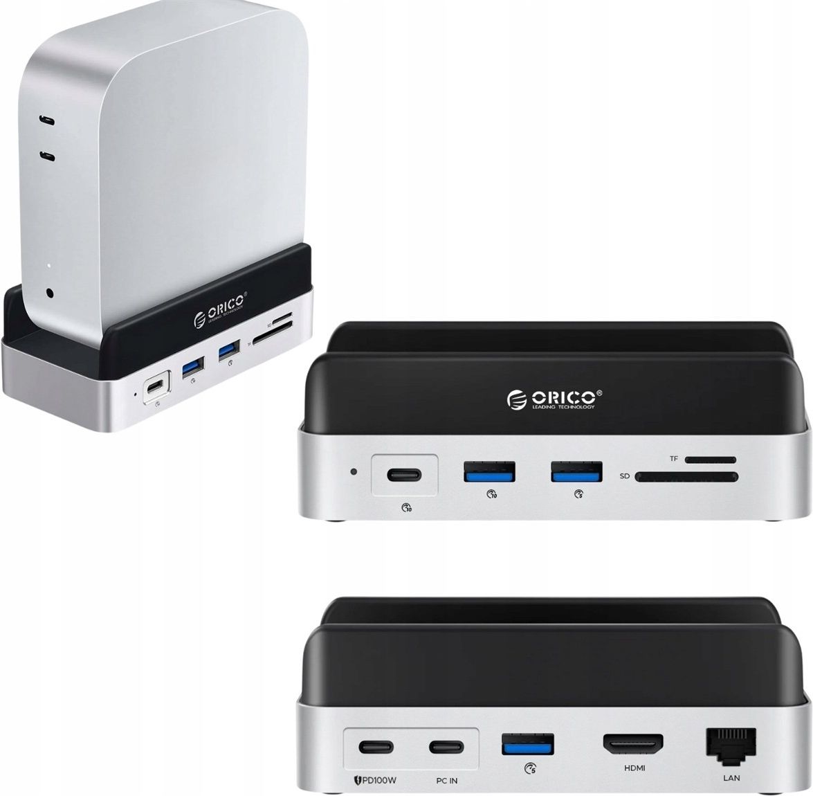 STACJA DOKUJĄCA HUB KIESZEŃ 10w1 Z KIESZENIĄ NA DYSK TWARDY SSD 8TB ORICO id: 1292939585 10 portów w jednym urządzeniu Możliwość rozbudowy pamięci nawet do 8 TB Obraz 4K i stabilne połączenie sieciowe Jednoczesna obsługa kart SD i TF Pionowa konstrukcja dla porządku na biurku Specyfikacja Marka: Orico Model: Orico MiniDock Kompatybilność: Mac mini 2024 Rodzaj dysku: M.2 (NGFF i NVMe) Maksymalna pojemność dysku: do 8 TB Interfejsy: USB-C: 10 Gbps USB-A: 10 Gbps USB-A x2: 5 Gbps HDMI: 4K@60 Hz RJ45: 1000 Mbps SD/TF: jednoczesny odczyt (ok. 80-100 MB/s) USB-C PD: do 100 W (przelot zasilania) USB-C PC IN: 10 Gbps Materiał: stop aluminium, silikon, tworzywo Wymiary: 135 x 65 x 43,5 mm Przewód w zestawie: USB-C - USB-C 10 Gbps, 0,3 m Obsługiwane systemy: Windows, Linux, macOS, Android Zawartość opakowania: stacja dokująca przewód USB-C - USB-C instrukcja obsługi śrubki montażowe (dla wersji z kieszenią M.2) podkładka termiczna (dla wersji z kieszenią M.2) opakowanie Kolor: srebrny Najważniejsze zalety stacji Orico MiniDock 10 portów w jednym miejscu: łatwo podłączysz monitor, sieć, akcesoria i karty pamięci bez ciągłego przepinania. Kieszeń na dysk M.2 do 8 TB: rozbudowujesz pamięć o szybki magazyn danych w wygodnej, biurkowej formie. HDMI 4K@60 Hz i LAN 1000 Mbps: stabilny obraz na zewnętrznym ekranie i przewodowy internet bez kombinowania. Czytniki SD i TF z jednoczesnym odczytem: sprawne zgrywanie materiałów z kart, także przy pracy z dwoma nośnikami. Pionowa konstrukcja oszczędzająca miejsce: Mac mini stoi stabilnie, a biurko pozostaje uporządkowane. Orico MiniDock 10w1 to kompaktowa stacja dokująca do Mac mini 2024, która porządkuje stanowisko pracy i rozszerza możliwości komputera o zestaw przydatnych portów oraz kieszeń na dysk M.2. Pionowa konstrukcja oszczędza miejsce na biurku, a szybkie złącza pozwalają wygodnie podłączyć akcesoria, monitor, sieć i karty pamięci. To praktyczne rozwiązanie do pracy, nauki i codziennego użytkowania, gdy chcesz mieć wszystko pod ręką, bez plątaniny kabli.