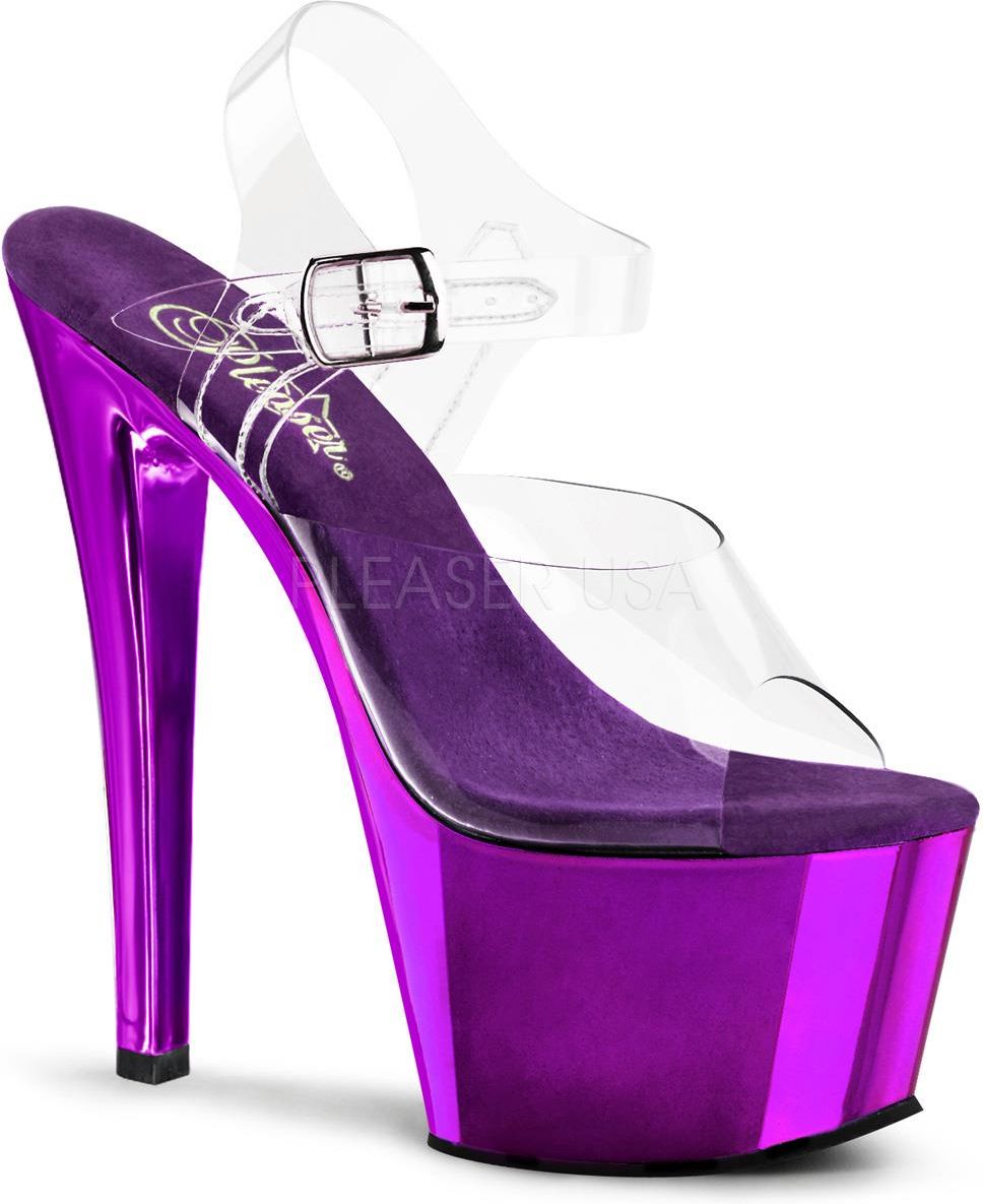 Sandały SKY-308 to doskonały wybór dla każdej kusicielki, która uwielbia nowoczesne, minimalistyczne wzornictwo. Buciki zostały stworzone z wysokiej klasy materiałów syntetycznych. Dzięki temu obuwie jest wygodne, a przy tym odporne na uszkodzenia mechaniczne różnego typu. Przezroczysta cholewka idealnie podkreśla kształt stopy. Regulowany pasek zapinany na sprzączkę, pozwala na dopasowanie obuwia, oraz gwarantuje stabilność i komfort w czasie chodzenia czy aktywności, na przykład tańca. 17.8 centymetrowe obcasy optycznie wysmuklają sylwetkę, nadając jej lekkości. 7 centymetrowe platformy niwelują wysokość słupka. Warto zwrócić szczególną uwagę na minimalistyczny, a przez to ponadczasowy design.To właśnie on sprawia, że ten model obuwia prezentuje się wyjątkowo. Buty SKY-308 spodobają się wszystkim kusicielkom, które nie boją się wyróżniać z tłumu. Sandały będą idealnie pasować do wielu różnych stylizacji. Nowoczesnych, jak i nieco bardziej romantycznych. Bez względu na okoliczności! Wszystko zależy tylko od naszej fantazji… Buty SKY-308 dostępne są w szerokiej gamie rozmiarów, od 35 do 44.
