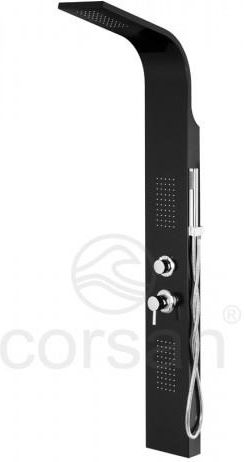 Panel prysznicowy z mieszaczem ALTO czarny/czarny AL-017 RAL9017 Parametry techniczne: Wysokość - 1500 mm, Szerokość - 190 mm, Wysięg deszczownicy - 500 mm, Wąż - 1500 mm, Waga - 10 kg Korpus panela: Korpus panela wykonano z aluminium, które cechuje się niespotykaną wytrzymałością, jest barwiony na kolor czarny mat. Deszczownica: Deszczownica wyposażona w 50 dyszy sprawia niesamowitą przyjemność. Dysze zostały wykonane w technologi Anti-Calc. Niweluje to możliwość wystąpienia awarii spowodowanej osadzaniem się kamienia. Wysięg deszczownicy - od ściany do końca deszczownicy w sumie 50 cm, daje to komfort (bez "przyklejania się" do korpusu panela). Wszystkie dysze wykończone sa systemem ANTI- CALC (silikonowe gumki, przez które kamień przepływa nie osadzając się wewnątrz panela - tym samym przedłużając jego trwałość i niezawodność). Dwa najlepszej klasy hydromasaże, w które wyposażony jest panel gwarantują niezmierny komfort użytkowania. Panel CORSAN ALTO posiada pokrętła, do których zostały przypisane konkretne funkcje panelu. Dzięki takiemu rozwiązaniu korzystanie z panela jest łatwe i przyjemne. Nowoczesny proces pokrywania mosiężnych elementów chromem nadaje efektowny i długotrwały połysk. Panel występuje w wersji z baterią mieszaczową, która odpowiedzialna jest za regulację przepływu i temperatury wody. Słuchawka prysznicowa wykonana jest z tworzywa sztucznego, przez co jest lekka i nigdy nie spowoduje uszkodzeń w kafelkach. Waż prysznicowy o długości 150 cm. Panel można montować na ścianie lub też narożnie. Proces montaż jest bardzo łatwy. Dbając o dobro klientów dołączamy do zestawu węże przyłączeniowe o długości 50 cm. Uwaga! Możliwy montaż narożny lub naścienny. Po zakupie proszę wybrać sposób montażu.