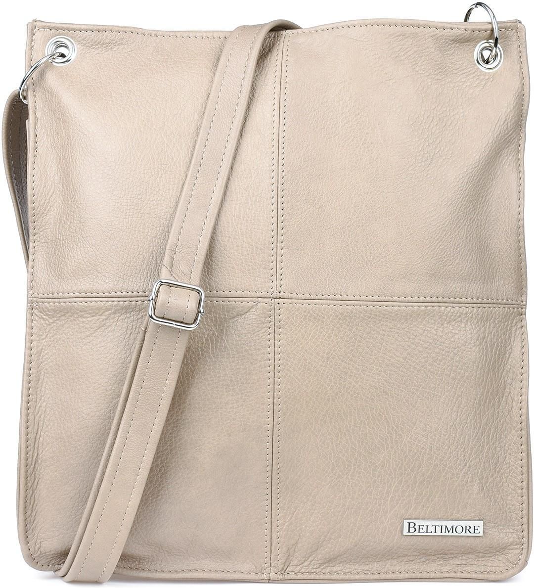 Kolory brązowy, beżowy Materiał Skóra naturalna Wielkość Duża, mieszcząca A4 Kolor okuć Srebrny Pasek Długi, regulowany Układ/Orientacja Pion Damska torebka listonoszka, wykonana z naturalnej skóry wysokiej jakości w pięknym, beżowym kolorze. Marka Beltimore Elegancka i pojemna Pomieści A-4, wygodnie się ją nosi Wymiary Długość podstawy: ok. 33,5 cm Wysokość ok. 36 cm Szerokość dna: ok. 8 cm Pasek regulowany: ok. 151 cm
