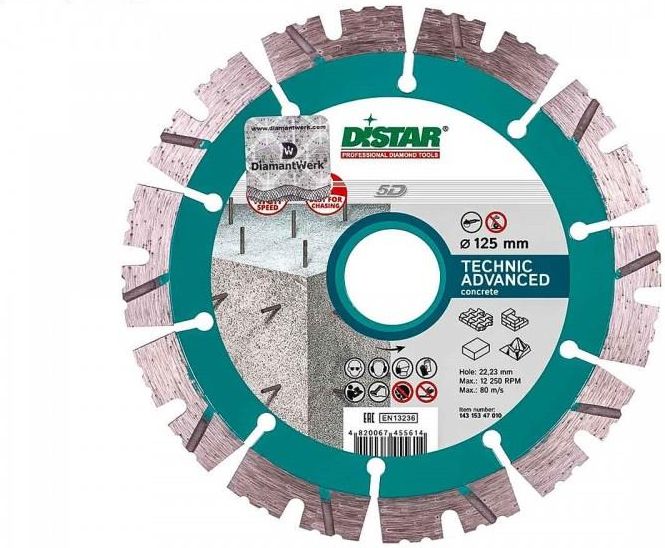 DISTAR TARCZA DIAMENTOWA DO BETONU TECHNIC ADVANCED 125mm x 22.23mm DS-14315347010 Opis tarczy diamentowej Distar Technic Advanced Zaprojektowana do wykonywania prac z kostką brukową, betonem i czarnym granitem. Ponadto stosuje się do cegły, betonu zbrojonego, piaskowca, kolorowego granitu. Tarcza diamentowa jest wykonana ze średnicą 125mm, o grubości segmentu 2,2 Wysokość powłoki diamentowej jest prawie taka sama, czyli 11-12 mm. Szybkość pracy wynosi 0,5 metra na minutę z resursem roboczym do 60 metrów bieżących na betonie marki M-400 ze zbrojeniem prętem do 12 mm. Ze względu na zaawansowany kształt segmentów, tarcza jest skutecznie chłodzona w zamkniętych obudowach bruzdownic, dzięki czemu ta tarcza idealnie nadaje się do wykonywania prac przy bruzdowaniu dla instalacji elektrycznych i hydraulicznych. Zdjęcia podglądowe Dane techniczne Średnica tarczy: 125mm Średnica otworu montażowego: 22,23mm Rodzaj tarczy: Tarcza diamentowa Zastosowanie: Cięcie twardych materiałów, takich jak beton zbrojony, granit, płyty chodnikowe Metoda cięcia: na sucho Wykończenie segmentów: Diamentowe W dostawie Tarcza diamentowa do betonu Technic Advanced 125mm x 22.23mm Distar 14315347010