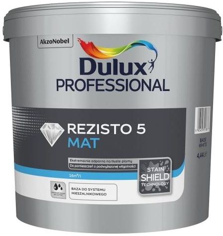 Farba Dulux Rezisto 5 Baza White 4,44L mat; kod produktu: 00921904 Farba Dulux Rezisto 5 Baza White 4,44L mat Antyrefleksyjna farba do ścian o niebywale potężnej odporności na plamy. Zastosowano tutaj nowoczesną, unikatową formułę Shield Technology, która sprawia, że malowane powierzchnie stają się w ogromnym stopniu odporne na tłuste plamy, szorowanie i mycie detergentami. Dodatkowo powłoka może być poddawana dezynfekcji. Jest szczególnie zalecana do stosowania w przypadku ścian narażonych na zabrudzenia, tak w budownictwie prywatnym, jak i biurowym. Baza White ze względu na dużą siłę krycia, wysoki poziom bieli oraz ultra niski stopień połysku (1 przy kącie 85°) idealnie sprawdzi się również jako farba do sufitów. Dulux Professional Rezisto 1 tworzy głęboko matowe, antyrefleksyjne powłoki, które niwelują niedoskonałości podłoża. Opakowanie: 4,44 l Kolor: biały (bazowy) Średnia wydajność: do 14 m²/l Zastosowanie: wewnętrzne Stopień połysku: mat Jest to baza do systemów barwienia, w kolorze białym. Istnieje możliwość wybarwienia jej na inny kolor.