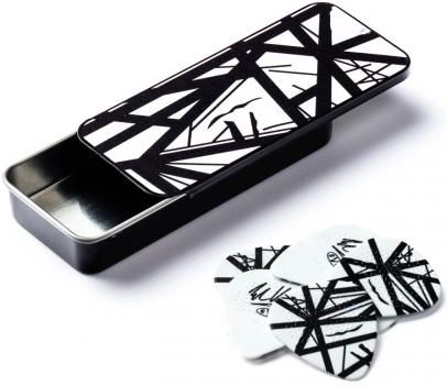 Kostki do gitary z kolekcjonerskiej serii firmy Dunlop, z serii Eddie Van Halen sygnature, w metalowym pudełku. Zestaw 6 sztuk kostek Dunlop Max-Grip o grubości 0.60 mm w pudełku z designem EVH White with Black Stripes. Oznaczenie twardości Medium.