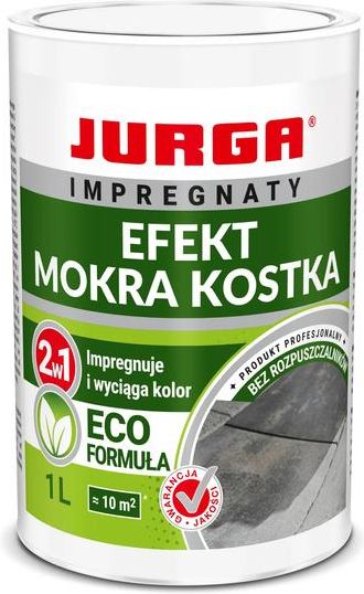 JURGA IMPREGNAT DO KOSTKI BRUKOWEJ EFEKT MOKRA KOSTKA Pojemność: 1L Kolor: bezbarwna ciecz Zużycie: 1 litr na 10m² przy jednej warstwie. Ilość warstw: 2 Aplikacja: pędzel, wałek, natrysk niskociśnieniowy, Impregnat do kostki brukowej i betonu, dający EFEKT MOKREJ KOSTKI. Nowoczesna ECO FOMUŁA …