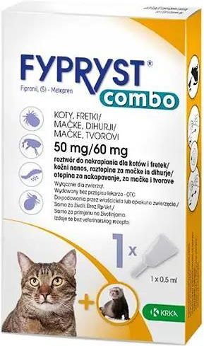 Krka Fypryst Combo Kot to środek przeciw pchłom i kleszczom, dla kotów i fretek. Produkt zapewnia skuteczną ochronę przed rozmnażaniem i nową infestacją dorosłymi postaciami pcheł przez okres do 4 tygodni oraz przed kleszczami przez okres do 2 tygodni. Preparat jest przeznaczony również dla fretek. Krka Fypryst Combo Kot - krople na pchły i kleszcze dla kotów i fretek Krka Fypryst Combo Kot to środek przeciw pchłom i kleszczom, dla kotów i fretek.Produkt zapewnia skuteczną ochronę przed rozmnażaniem i nową infestacją dorosłymi postaciami pcheł przez okres do 4 tygodni oraz przed kleszczami przez okres do 2 tygodni. Jest skuteczny w zwalczaniu APZS (Alergicznego Pchlego Zapalenia Skóry). Preparat jest przeznaczony również dla fretek, do zwalczania inwazji pcheł lub w inwazjach mieszanych z kleszczami.Substancje czynne: Fipronil, Metopren.Przeciwwskazania: Nie stosować u kociąt w wieku poniżej 2 miesięcy. Nie stosować u fretek w wieku poniżej 6 miesięcy. Nie stosować u zwierząt chorych. Nie stosować u królików. Nie stosować w przypadku nadwrażliwości na substancję czynną lub na inne składniki produktu. Inne suplementy i preparaty dla kotów, znajdziesz tutaj - Kot - Preparaty.Dostępne opakowania: 1 pipetka. Pamiętaj, że więcej informacji na temat promocji i wyjątkowych ofert znajdziesz na naszych kanałach społecznościowych: Facebook/miskakarmypl oraz Instagram/miskakarmy.pl/