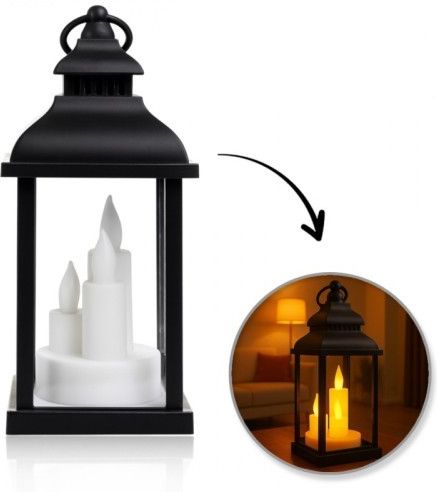 Lampion dekoracyjny LED z imitacją świec Stylowy czarny lampion z tworzywa sztucznego z realistyczną imitacją świec LED. Idealny do wnętrz i na zewnątrz– tworzy nastrojowe, ciepłe światło bez otwartego ognia. Lekki, trwały i bezpieczny w użytkowaniu. Specyfikacja: Materiał: tworzywo sztuczne, szkło Kolor: kremowy, czarny Kolor światła: ciepły biały, mrugające światło Zasilanie: 2 x AA Wymiary lampionu: 10 x 10 x 22 cm Wymiary opakowania: 10,5 x 10,5 x 22,5 cm Waga: 298 g Waga z opakowaniem: 361 g Lampion zapakowany jest w ozdobne kartonowe pudełko idealne na prezent. Zestaw nie zawiera baterii.