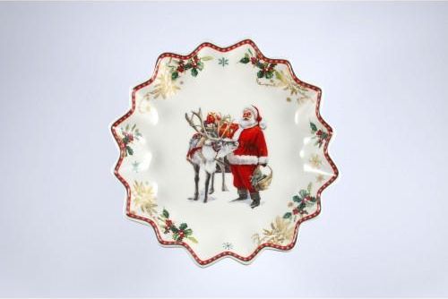 Oryginalna, świąteczna paterka Magnoble - Merry Christmas Przedstawiony produkt wykonany został przez chiński koncern "Shenzhen Hua Mei", istniejący od około 20 lat, który swoje wyroby produkuje w Chinach, ale studio projektowe posiada w Anglii. Koncern dostarcza swoją porcelaną klasy premium pod marką "Magnoble" oraz artykuły kuchenne do wielu domów towarowych, dystrybutorów oraz supermarketów na całym Świecie(aktualnie jest to aż 60 krajów, w tym USA, Francja, Niemcy, Wielka Brytania).Podstawowa specyfikacja: wysokość = do około 3cm średnica = do około 23,5cm rodzaj porcelany: kostna t. "New Bone China", dobrej jakości(nieco grubsza od tradycyjnej, kostnej) motyw: wyraźny, trwale naniesiony, bez złoceń sposób pakowania: opakowanie kartonowe