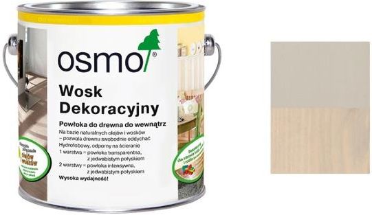OSMO® WOSK DEKORACYJNY tworzy powlokę o jedwabistym połysku, łączący zalety naturalnych olejów roślinnych i wosków. Jest odporny na brud, wodę oraz odporny na ścieranie, a powierzchnia jest miła w dotyku. W porównaniu do tradycyjnych powłok w przypadku wosku Osmo powstaje jednolita i harmonijna barwa dzięki użytym składnikom roślinnym. Produkt jest łatwy w użyciu, nie wymaga gruntowania i międzyszlifu - oszczędza czas i pieniądze. Nie zatyka porów drewna, nie rozwarstwia się, nie pęka i nie łuszczy się. Jest odporny na zabrudzenia z wina, piwa, coli, herbaty, soków, mleka i wody. Powłoka po wysuszeniu jest nieszkodliwa dla ludzi, zwierząt i roślin (jest bezpieczną powłoką dla zabawek dziecięcych). Zastosowanie:Ściany, sufity, drzwi, listwy, belki, lignofol, płyty wiórowe i korek. Szczególnie polecany do gruntowania kolorem podłóg drewnianych oraz jako jedyna powłoka do drewna w pomieszczeniach o wysokiej wilgotności (kuchnia, łazienka). Idealny do mebli i zabawek drewnianych. Przygotowanie:Powierzchnia drewna musi być czysta, sucha i bez śladów zmrożenia (max. wilgotność drewna 20%). Osmo Wosk Dekoracyjny jest gotowy do użycia, nie rozcieńczać. Dobrze wymieszać. Oczyścić powłoki nie zatykające porów. Usunąć stare powłoki lakierowe. Wypełnić drobne pęknięcia i dziury w drewnie (Osmo Szpachlą do drewna). Powierzchnię drewna starannie wyszlifować. Przed olejowaniem dokładnie czyścić szlifowaną powierzchnię. Jeśli to możliwe, nanieść pierwszą warstwę z każdej strony prze montażem. Sposób użycia: Efekt przezroczysty barwiący: środek nakładać cienka warstwą przy pomocy twardego pędzla lub wałka Osmo zgodnie z kierunkiem słojów drewna, dokładnie rozsmarować. Pozostawić do wyschnięcia przy dobrej wentylacji. Aby uzyskać intensywniejszy kolor, cały proces powtórzyć (można nanieść maksymalnie 2 warstwy). Efekt lekko barwiący – efekt bejcowania: w ciągu 20 min. po nałożeniu wytrzeć szmatką lub białym Padem, zgodnie z kierunkiem słojów drewna. Pozostawić do wyschnięcia przy dobrej wentylacji. Efekt intensywnie barwiący: W tym celu polecamy Osmo Wosk Dekoracyjny Creativ. Ważne: W przypadku podłóg nakładać tylko 1 warstwę. Po gruntownym wysuszeniu należy nałożyć warstwę bezbarwnego Wosku Twardego Olejnego Osmo. Efekt malowania zależny jest m.in. od właściwości drewna, dlatego też zalecane jest wykonanie próby. Okres trwałości:5 lat lub dłużej, jeśli produkt przechowywany jest w suchych warunkach i jest szczelnie zamknięty. Jeśli produkt zgęstnieje pod wpływem mrozu, należy przechowywać go w temperaturze pokojowej na 24-36 godzin przed użyciem. Czas schnięcia:Ok. 24 h (temperatura 23oC, 50% wilgotności powietrza). W niskich temperaturach i/lub przy wysokiej wilgotności powietrza okres schnięcia wydłuża się. WAŻNE!!! Chronić przed dziećmi. Unikać zanieczyszczenia skóry i oczu. Zanieczyszczone oczy natychmiast przemyć dużą ilością wody i zasięgnąć porady lekarza. Tekstylia nasączone płynnym środkiem należy po ich użyciu natychmiast uprać lub przechowywać w szczelnie zamkniętym metalowym pojemniku (duże niebezpieczeństwo samozapłonu).