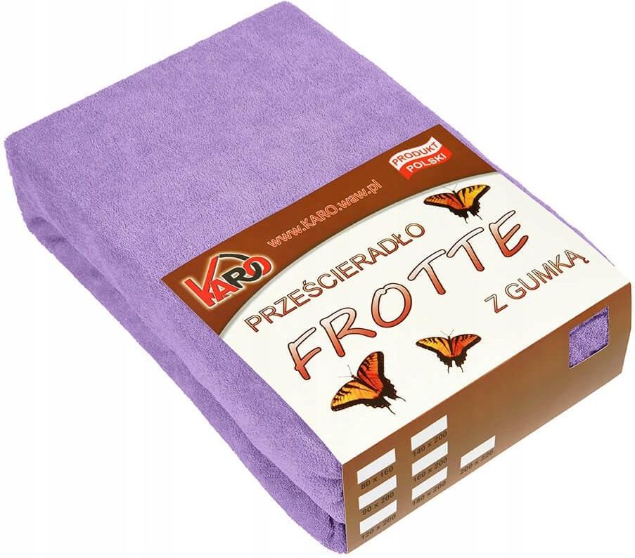 Prześcieradło frotte z gumką 120x200 fioletowe 022 grube 200g/m2 KARO KARO Prześcieradło frotte z gumką 120x200 fioletowe 022 grube 200g/m2 KARO Prześcieradło frotte z gumką jest miękkie i przyjemne w dotyku, a spanie na nim to czysta przyjemność. Szeroka gama kolorystyczna pozwoli na dopasowanie koloru prześcieradła do każdej pościeli. Z kolei wysoka jakość zastosowanych materiałów sprawi, że długo będziesz cieszyć się wyborem prześcieradła KARO. Prześcieradło zachowuje swój fason i utrzymuje intensywny kolor nawet po wielu praniach. Do prześcieradła polecamy również pościele dostępne na innych naszych podstronach. Rozmiar: 120x200 cm. Tolerancja rozmiaru +/-3%. Zakład prześcieradła wynosiok 15cm i nie jest wliczany do rozmiaru. Prześcieradło przeznaczone jest na materace o wysokości do 15 cm. Dzięki bokom z narożnymi zaszewkami, profilującymi prześcieradło do kształtu materaca oraz gumce poprowadzonej w tuneliku produkt doskonale dopasowuje się i układa na materacach o różnej grubości. Skład tkaniny: 82% bawełna, 18% poliester. Materiał: frotte - lekko rozciągliwy i niewymagający prasowania, dzięki czemu jest wyjątkowo wygodny w użytkowaniu. Gramatura: 200 g/m2 - najgrubsze prześcieradło na polskim rynku. Prześcieradła frotte z gumką KARO występują w 14 rozmiarach tj. 60x120, 70x140, 70x160, 80x160, 80x200, 90x200, 120x200, 140x200, 160x200, 160x220, 180x200, 200x200, 200x220, 220x240 w ponad 40 kolorach. Przepis konserwacji: prać w temperaturze do 40°C, nie wybielać, nie prasować, nie czyścić chemicznie, suszyć w stanie rozwieszonym. Indeks katalogowy: 207212 Kod kreskowy EAN: 5904941800833 Marka: KARO