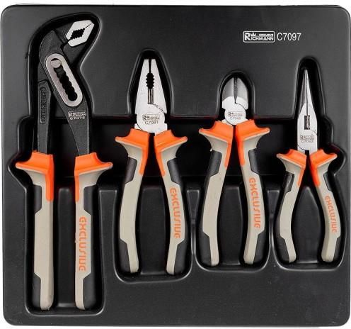 Zestaw zawiera 4 sztuk najczęściej wykorzystywanych szczypiec. Wykonane z stali chromowo-wandowej (CR-V) zastosowany chrom gwarantuje odporność stali na korozję, utlenianie, ścieranie i dużą wytrzymałość w wysokiej temperaturze, zaś dodatek wanadu również wpływa na odporność na działanie wysokich temperatur oraz nieuleganie deformacjom. Rękojeści pokryte specjalną antypoślizgową powłoką. Pokryte antykoryzyjną powłoką. Zestaw umieszczony we wkładzie do wózka narzędziowego o wymiarach: 270 x 295 mm. Jakość premium.