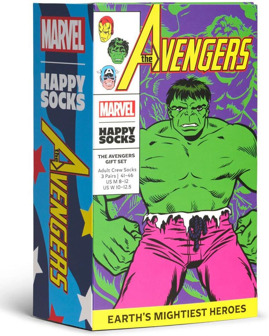 Happy Socks MARVEL Avengers 3-Pack Gift Set to zestaw trzech par skarpet inspirowanych kultowymi bohaterami: Kapitanem Ameryką, Iron Manem i Hulkiem. Idealny wybór dla fanów komiksów i wyjątkowy prezent w kolekcjonerskim opakowaniu.