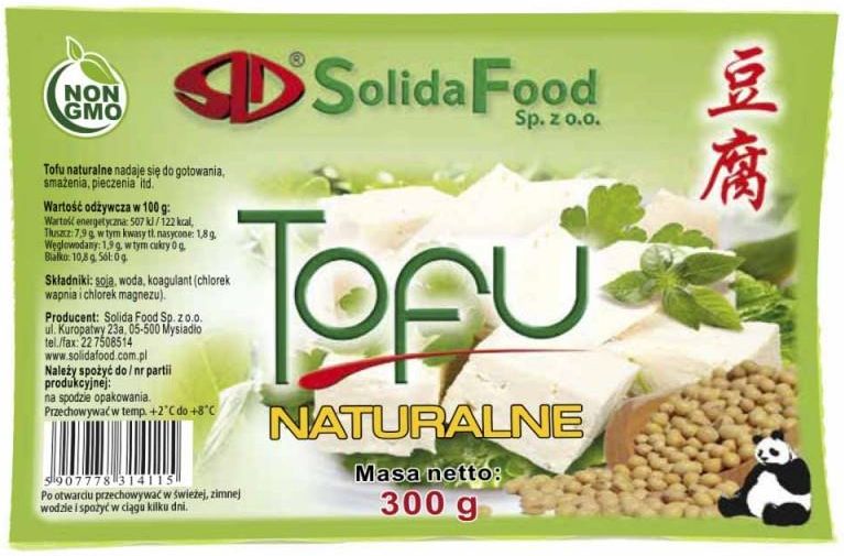 Zależy nam na wysokiej jakości naszych produktów. Tofu jest produkowane z soi niemodyfikowanej genetycznie w Mysiadle pod Warszawą. Tofu Solida Food dostępne jest w wielu sklepach w całej Polsce. Do najbardziej ogólnodostępnych zaliczamy Carrefour czy Kuchnie Świata. Obejrzyj ciekawe animacje i przepisy o Tofu! Właściwości Tofu posiada wiele cennych wartości odżywczych. Jest cennym źródłem białka oraz roślinnych tłuszczów nienasyconych,szeregu witamin, a także składników mineralnych. Serek sojowy należy do grona niskokalorycznych produktów (100g w zależności od rodzaju tofu dostarcza jedynie 122 kcal), ale jednocześnie do produktów dających dużą sytość. Jako, że jest produktem pochodzenia roślinnego, to nie zawiera cholesterolu. Tofu dostarcza organizmowi aminokwasy egzogenne oraz kwas linolowy i lecytynę. Porcja tofu jest dobrym źródłem składników mineralnych takich jak: wapń, żelazo, potas, fosfor, magnez, cynk, selen, mangan, miedź oraz witamin: choliny, witamin z grupy B (B1, B2, B6, kwas foliowy), witaminy A. Tofu może być gotowane na parze, w sosach lub smażone. Tradycyjne twarde tofu, które zyskało dużą popularność w Azji jest mniej kruche i bardziej zbite. Sprawdza się szczególnie jako dodatek do potraw, ponieważ dobrze wchłania marynaty i przyprawy. Wartość odżywcza w 100g produktu Wartość energetyczna 507 kJ 122 kcal Tłuszcz w tym kwasy tłuszczowe nasycone 7,9 g 1,8 g Węglowodany w tym cukry 1,9 g 0 g Białko 10,8 g Sól 0 g