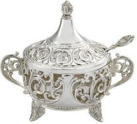 Cukiernica platerowana* to wyjątkowy i elegancki przedmiot, który doskonale sprawdzi się zarówno na specjalne okazje, jak i w codziennym użytku. To nie tylko pojemnik na cukier, ale także ozdoba stołu, która dodaje uroku każdemu przyjęciu lub spotkaniu. Oto kilka kluczowych cech i informacji na temat cukiernicy platerowanej: Wyjątkowy design: Cukiernica platerowana jest wykonana z wysokiej jakości metalu, który został poddany procesowi platerowania. Dzięki temu produkt ten prezentuje się bardzo elegancko i efektownie(atrakcyjnie zdobiona). Funkcjonalność: Ten produkt służy do przechowywania cukru, co sprawia, że jest niezbędny podczas serwowania herbaty, kawy czy innych napojów. Cukiernica jest wyposażona w pokrywkę/wieczko, które chroni cukier przed zanieczyszczeniem i też trochę przed wilgocią. Doskonała dekoracja stołu: Cukiernica platerowana to nie tylko praktyczny pojemnik, ale również element dekoracyjny stołu. Może być używana codziennie, ale również na różnego rodzaju uroczystościach, np.: rodzinne spotkanie ;-) Dzięki swojej elegancji i blaskowi przyciąga uwagę gości i nadaje prestiżu każdej okazji. Trwałość: Dzięki zastosowaniu platerowania, cukiernica jest odporowa na korozję i utratę blasku, a to oznacza, że będzie służyć przez wiele lat, zachowując swój piękny wygląd. Łatwa konserwacja: Cukiernicę platerowaną można łatwo utrzymywać w czystości, wystarczy regularnie ją czyścić i polerować, aby zachować jej blask i elegancję. Cukiernica platerowana to wyjątkowy produkt, który łączy w sobie funkcjonalność i estetykę. Dzięki swojemu wyglądowi i trwałości, doskonale sprawdza się jako element dekoracyjny stołu oraz praktyczny naczynie do serwowania cukru. Jest to również doskonały pomysł na prezent dla bliskich lub jako ozdoba w Twojej własnej kuchni. */proces platerowania zwany również galwanizacją, to technika powlekania przedmiotów warstwą metalu w celu poprawienia ich wyglądu, trwałości i innych właściwości. Platerowanie polega na pokrywaniu powierzchni danego przedmiotu cienką warstwą metalu, najczęściej złota, srebra lub miedzi, w celu uzyskania pożądanych właściwości estetycznych lub ochrony przed korozją. Proces ten jest szeroko wykorzystywany w przemyśle jubilerskim, produkcji zastawy stołowej(jak np.: cukiernice z naszej oferty), galanterii oraz w wielu innych dziedzinach.