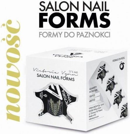 Victoria Vynn Salon Nail Forms Black 100 szt. Formy do przedłużania paznokci o doskonałym salonowym kształcie, wykonane z metalizowanego, laminowanego papieru. Idealne do pracy z bazą hybrydową Mega Base, żelem i akrylo-żelem. CECHY PRODUKTU Idealne do salonowych przedłużeń Bardzo wytrzymałe i optymalnie sprężyste, wykonane z metalizowanego, laminowanego papieru Bardzo mocny klej gwarantuje stabilność szablonu podczas modelowania paznokci Zaznaczone linie ułatwiają precyzyjne przedłużanie: symetrii, krawędzi bocznej i kwadratu, migdała, pomocnicze Wewnętrzne nacięcia pomagają perfekcyjnie ułożyć formę i ukształtować idealny tunel Krótkie skrzydełka uławiają utwardzanie w lampie Formy pakowane w pudełko z wycięciem umożliwiającym łatwe wysuwanie szablonu Opakowanie zawiera 100 szt.