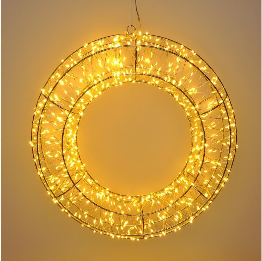 Metalowy wieniec adwentowy z diodami LED do użytku wewnętrznego i zewnętrznego.Liczba diod LED: 480.Kolor światła: ciepła biel.Stopień ochrony: IP44 (do użytku na zewnątrz).