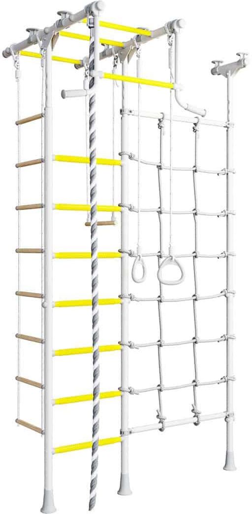 Drabinka gimnastyczna Merkury 2 ELEMENTY ZESTAWU metalowa drabina gimnastyczna drążek nieprzesuwny koła gimnastyczne lina huśtawka gimnastyczna (trapez) drabinka linowa słupek z siatką WAZNE Słupek zamontujemy z dowolnej strony i pod dowolnym kątem do drabinki gimnastycznej Zestaw przeznaczony dla dzieci od 3 lat i dorosłych Dopuszczalne obciążenie drabinki z drążkiem: 100 kg Dopuszczalne obciążenie akcesoriów i siatki: 50 kg Szerokość drabinki: 53 cm Wysokość zestawu: 232 cm - 280 cm Szerokość słupka: 87,6 cm Szerokość całkowita: 156 сm Głębokość: 106 cm Montaż: rozporowo Kolorystyka: żółto-niebieski, żółto-jasnozielony, żółto-pomarańczowy, żółto-srebrny Zalecenia producenta: dzieci od 3 do 7 lat powinny ćwiczyć tylko pod nadzorem rodziców Zalecana bezpieczna odległość od ściany zapobiegająca zakleszczeniu głowy dziecka: 25 cm
