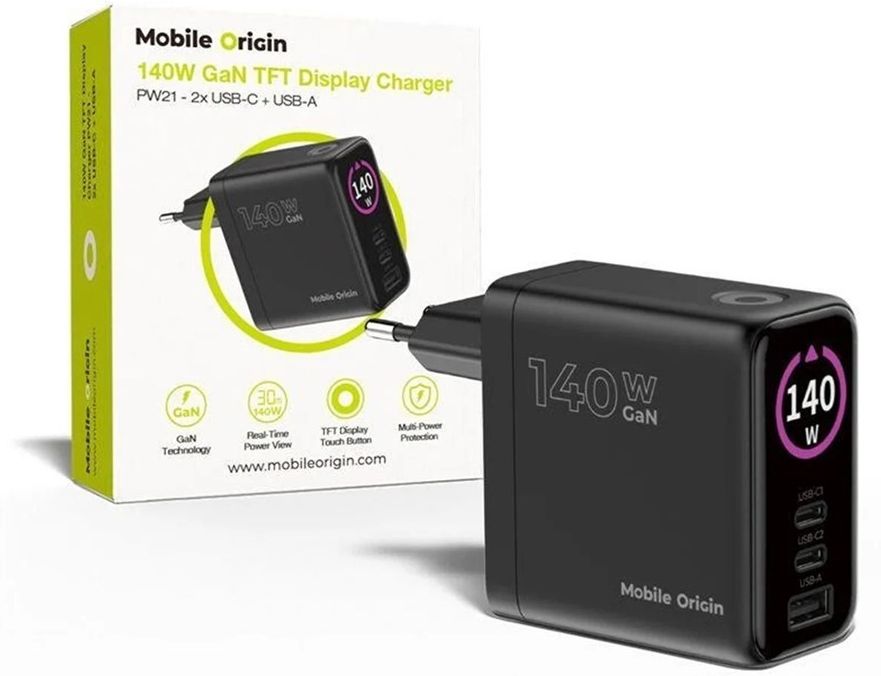 Mobile Origin 140W GaN Display Charger PW21 - 2x USB-C + USB-A 140W fast charging with the latest GaN technology in a sleek and compact design. Charge up to 3 devices simultaneously thanks to 2x USB-C and 1x USB-A ports. The charger includes a display for monitoring the charging performance in real time. Ideal for home and travel, it provides speed, safety and portability anywhere on the go. 140W output power GaN technology Power Delivery (PD) technology 2x USB-C + USB-A TFT Display Overcharge, overheating and short circuit protection for safe and reliable charging Key Features 3 Charging Ports:Fast and efficient charging with high-speed 2x USB-C ports and a USB-A port for charging up to three devices simultaneously. Maximum combined power 140WFast charging on the go with 2x USB-C (140W when charging separately) or USB-A (18W). Maximum combined power is 140W. Small but more powerful: Compact, faster and more efficient. This GaN charger delivers high performance with lower heat generation, saves space and charges intelligently. TFT Display: Discover the future of charging with our advanced 140W GaN charger, which combines a compact design with a smart display for instant performance monitoring!The black rugged case with integrated TFT display allows you to simply press a button to see the current output in real time. Always keep your device charging under control. Compact and lightweight:With dimensions of 105 x 68 x 35 mm and a weight of only 240g, this adapter is easily portable. Tech Specs Input: 110-240V~50/60Hz 2A Output: 140W Max USB-C1/C2: 5V⎓3A, 9V⎓3A, 12V⎓3A, 15V⎓3A, 20V⎓5A, 28V⎓5A (140W Max) USB-A: 5V⎓3A, 9V⎓2A, 12V⎓1.5A (18W Max) USB-C1 + USB-C2: - 100W+35W (135W Max) USB-C1 + USB-A: - 100W+18W (118W Max) USB-C2 + USB-A: - 100W+18W (118W Max) USB-C1 + USB-C2 + USB-A:65W+45W+18W (128W Max) Dimensions: - 105 x 68 x 35 mm Weight: 240g Colour: black *Charging speed depends on the total power of the charger (W) and the maximum power that the device supports. If the charger provides more power than the device can handle, the output will automatically adjust to avoid damage to the device. Package contents GaN Power Charger with Display 140W PW21 – 2x USB-C + USB-A User Manual