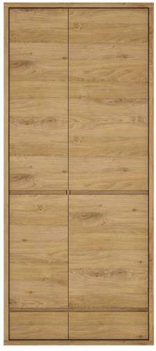 Szafa dwudrzwiowa z kolekcji Shetland, od Meble Wójcik, tworzy funkcjonalny system przechowywania całej garderoby. Mebel dysponuje licznymi półkami, drążkiem na wieszaki oraz szufladami, dzięki czemu pomieści zarówno odzież wiszącą, jak i drobniejsze koszulki, spodnie czy bieliznę. Szafa stanowi też elegancki i nowoczesny element wyposażenia, który można wykorzystać w różnych pomieszczeniach - w sypialni, pokoju gościnnym lub przedpokoju. Czym charakteryzuje się szafa ubraniowa Shetland? Szafa z półkami i drążkiem Shetland została wykonana z wysokiej jakości laminowanej płyty, odpornej na wilgoć, wysoką temperaturę i uszkodzenia mechaniczne. Mebel ma gładką, łatwą w czyszczeniu i niewymagającą w pielęgnacji powierzchnię. Wykorzystuje również system bezuchwytowy, dzięki któremu jego bryła nie posiada żadnych wystających elementów. We wnętrzu szafy użytkownik znajdzie liczne, różnej wielkości wnęki na poukładaną odzież lub obuwie, a także drążek odzieżowy i dwie praktyczne szuflady na akcesoria, bieliznę czy biżuterię. W jakiej aranżacji sprawdzi się szafa Shetland? Nowoczesna szafa z szufladami na dole z kolekcji Shetland została wybarwiona na dekor Dąb Shetland z poziomym rysunkiem słojów. Takie wykończenie nadaje jej elegancki i ciepły wygląd, przełamany przez szary dekor wnętrza mebla. Szafa charakteryzuje się również prostą i masywną bryłą zaprojektowaną w minimalistycznym stylu. Pasuje zatem do aranżacji nowoczesnych, w których stawia się na prostotę i funkcjonalność. Wymiary szafy Szerokość: 86 cm Głębokość: 58 cm Wysokość: 197 cm