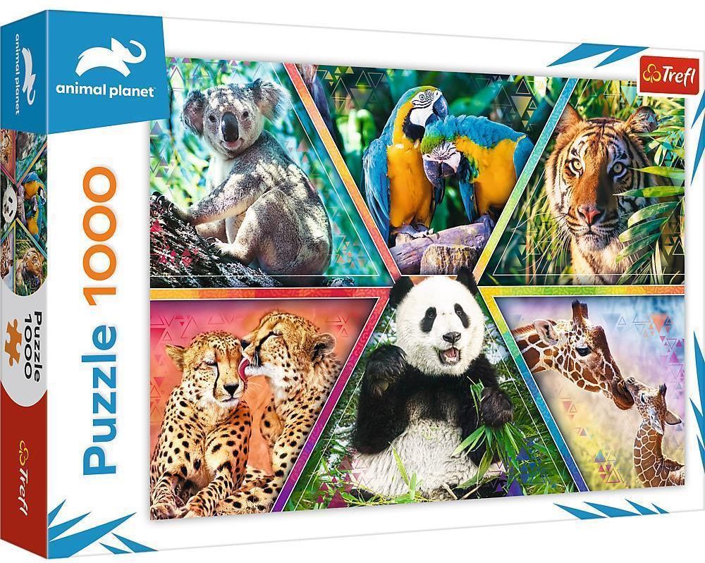 Trefl Puzzle 1000el. Królestwo zwierząt 10672 Puzzle składające się z 1000 elementów przedstawiające Królestwo Zwierząt. Po ułożeniu powstanie obrazek o wymiarach 683x480 mm. Produkt został wykonany z wysokiej jakości materiałów, z zastosowaniem specjalnego kalandrowanego papieru odbijającego światło, co ułatwia układanie. Puzzle produkowane od lat! Od 1985 roku w Trefl SA poświęcamy się temu, aby zagwarantować niezapomniane doznania podczas układania puzzli, które produkowane są w 100% w Polsce. Nasze układanki tworzymy z pasją, a każdy element cechuje wysoka jakość wykonania.  Dzięki wykorzystaniu papieru niwelującego odbicie światła, sprawiamy, że układanie staje się jeszcze przyjemniejsze. Po ułożeniu puzzli możesz utrwalić obrazek klejem i powiesić swoje dzieło na ścianie.  Zalety układania puzzli Puzzle to świetna rozrywka dla każdego, niezależnie od wieku czy umiejętności. To także dobry trening dla umysłu i ciała. Układając, wyrównujemy oddech, tempo bicia serca oraz spada ciśnienie krwi. Kompletowanie układanki uczy cierpliwości i wytrwałości, co przekłada się na umiejętności przydatne w codziennym życiu. Odkryj nową pasję już dziś! Szukasz pomysłu na miły wieczór w domowym zaciszu? Układanie puzzli to świetny sposób na spędzenie wolnego czasu w gronie przyjaciół i rodziny a do tego rewelacyjny trening dla mózgu. Szeroki wybór wzorów pozwala wybrać układankę dopasowaną do Twoich zainteresowań. Puzzle są doskonałym prezentem z okazji urodzin lub świąt. Odkryj Niezbędnik Puzzlomaniaka!