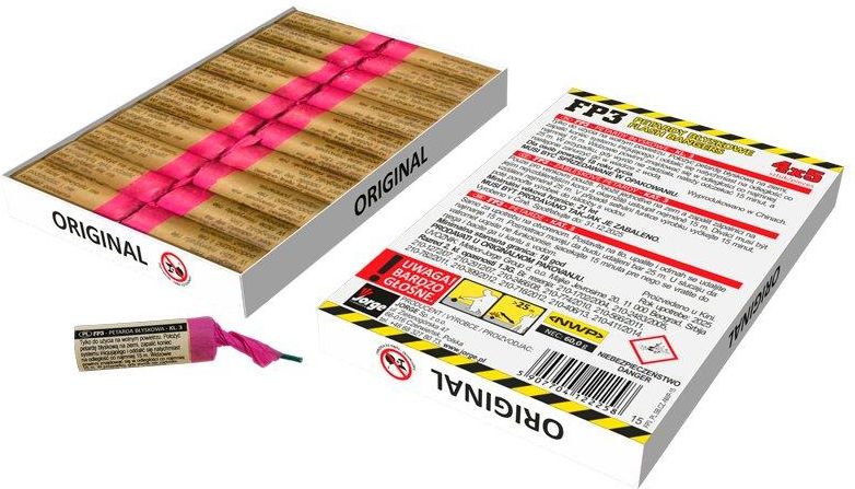 FP3 kultowe petardy od Jorge z zielonym flaschem zestaw 10opakowań czyli 200 sztuk petard (cena jednostkowa 0,62 zł/sztukę) Petardy FP3 Potrzebujesz materiałów pirotechnicznych na wesele, rekonstrukcję historycznej bitwy lub do odstraszenia zwierząt? W naszej ofercie znajdziesz m.in. niezawodne petardy hukowe FP3. To kultowe, bestsellerowe petardy lontowe od znanego i cenionego polskiego importera JORGE. Dają doskonały efekt świetlny i mocny huk, który świetnie imituje np. wybuchy wojenne. Produkt jest łatwy w użyciu, ale jak każdy materiał pirotechniczny wymaga zachowania ostrożności przy stosowaniu. Każda petarda FP3 ma certyfikat CE. FP3 — petardy do wielu zadań Oprócz funkcji typowo rozrywkowej, jaką mają dystrybuowane przez nas petardy FP3, możesz wykorzystać je na wiele innych sposobów. Świetnie nadają się na: różnego rodzaju uroczystości, takie jak wesela, jubileusze, wieczory panieńskie i kawalerskie, Nowy Rok urodziny, imieniny, do odstraszania dzikiej zwierzyny: saren, dzików, wilków, łosi, do odstraszania ptaków, np. niszczących sady szpaków. Petarda FP3 — instrukcja obsługi Każe opakowanie zawiera 20 sztuk petard hukowych FP3. Są one ułożone w kartoniku i dodatkowo zabezpieczone folią, co zapobiega przypadkowemu zawilgoceniu i problemom z odpaleniem. Pamiętaj, aby używać tych materiałów tylko na świeżym powietrzu. Po zapaleniu lontu należy odrzucić petardę i oddalić się na co najmniej 15 metrów. Jeżeli wyrób nie zadziała, odczekaj 15 minut i zanurz petardę w pojemniku z wodą.