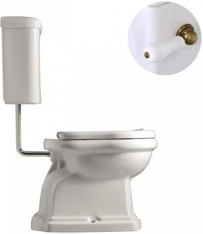 Miska do kompaku - odpływ : poziomy - wersja bez kołnierza wewnętrznego : nie - sposób montażu: do posadzki - kolor : biały Dolnopłuk - uruchamienie : z boku - dopływ wody : z boku - kolor : biały Rura spłukująca do dolnopłuku - łączy zbiornik z miską WC - materiał : mosiądz - kolor : stare złoto Mechanizm spłukujący - uruchamienie : z boku - kolor przycisku : stare złoto Do kompletowania z deską