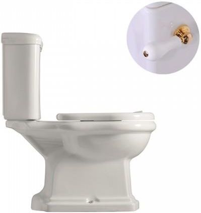 Miska do kompaku - odpływ : pionowy - wersja bez kołnierza wewnętrznego : nie - sposób montażu: do posadzki - kolor : biały Zbiornik - uruchamienie : z boku - dopływ wody : z dołu - kolor : biały Mechanizm spłukujący - uruchamienie : z boku - kolor przycisku : złoty Do kompletowania z deską