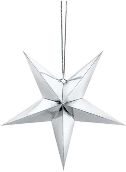Urocza gwiazda wprowadzi nas w cudowny nastrój Świąt Bożego Narodzenia.Pięknie zaprezentuje się w pokoju, biurze, a nawet na choince. Przestrzenna dekoracja wykonana ze srebrnego, lustrzanego papieru, mocowana za pomocą srebrnego sznureczka.Pięcioramienna gwiazda do samodzielnego złożenia. Średnica gwiazdki: 30 cm Wisząca gwiazda to doskonały element dekoracji świątecznej.