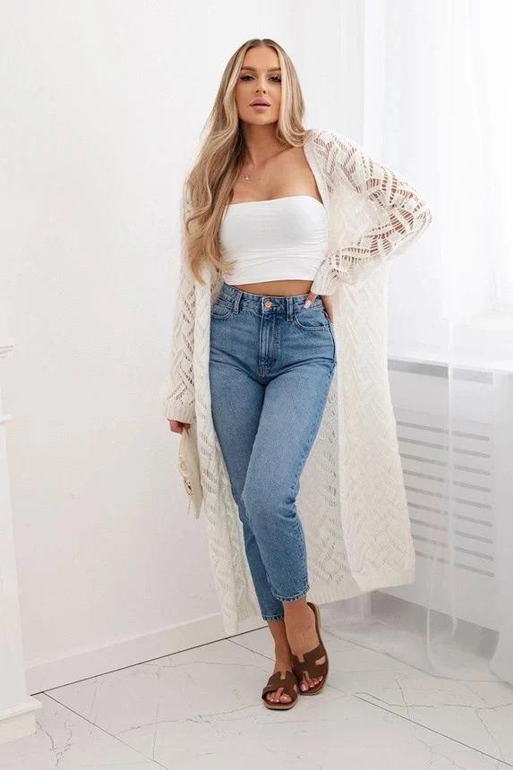 Kardigan z moheru Super KID w stylu boho Ecru Ten długi kardigan wykonany z wysokiej jakości moheru Super KID to idealny wybór na chłodniejsze dni. Ażurowy wzór i jasny pomarańczowy kolor nadają mu lekkości i energii. Luźny krój zapewnia komfort noszenia, a styl boho dodaje unikalnego charakteru. …