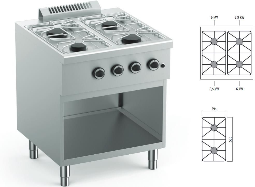 Kuchnia MBM EcoLine charakteryzuje się wysoką jakością wykonania oraz energooszczędnością, co sprawia, że jest idealnym wyborem dla gastronomii. – Wodoszczelny blat roboczy ze stali nierdzewnej AISI 304 o grubości 1 mm. – Zaokrąglone rogi ułatwiające czyszczenie. – Podpory pod garnki ze stali chromowanej. – Wyjmowane emaliowane palniki żeliwne z zapłonem elektrycznym. – Układ palników umożliwia używanie naczyń o średnicy do 40 cm – Na podstawie z 3 stron zamkniętej – Przyłącze gazu: 1/2” wymiary: 700x718x(H)850 mm moc palników: 2x 3,5 kW i 2x 6 kW łączna moc: 19 kW waga: 103 kg