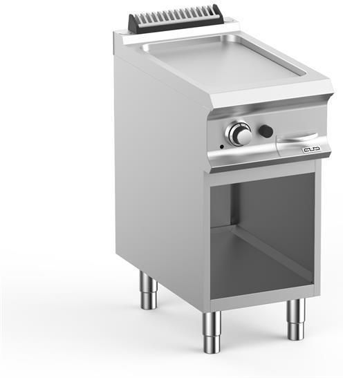 Płyta grillowa na podstawie z linii DominaPro 700 marki MBM Cechy: • NOWOŚĆ! Płyta grillowa umieszczona 3 cm poniżej poziomu blatu • Płyta grillowa o grubości 15 mm, z zaokrąglonymi narożnikami, wykonana ze stali węglowej, polerowana lub chromowana. • Opcjonalny, łatwo wyjmowany, teflonowy korek ułatwiający czyszczenie i zrzut tłuszczu do nierdzewnej szuflady o pojemności 2 l • W modelach o szer. 70 cm możliwość gotowania różnych produktów dzięki niezależnym elementom grzewczym (gaz/el.) • Płyta chromowana pozwala na przyrządzanie różnych produktów bez ryzyka mieszania sie smaków i zapachów (wybrane modele). Umożliwia to gotowanie bez potrzeby czyszczenia płyty w ciągu dnia pracy • Ponadto chromowana powierzchnia emituje mniej ciepła, co sprawia, ze praca jest bardziej komfortowa i przyjazna dla użytkownika Solidność: • Blat roboczy 1,5 mm ze stali stal nierdzewnej AISI 304 18/10 • Płyta grillowa 15 mm gładka lub chromowana • Dno ze stali nierdzewnej gwarantuje lepsza odporność • Klasa wodoodporności IPX5 Osiągi: • Jednorodność temperatury i precyzyjna kontrola termostatyczna od 145 do 290 °C (wersje gazowe) i od 75 do 290 °C (wersje elektryczne), umożliwia przygotowanie również delikatnych potraw Higiena: • Nowe wspawane w blat płyty dla zapewnienia maksimum higieny • Nowa zdejmowana osłona przeciw bryzgowa (opcjonalna) ułatwiająca czyszczenie • Idealnie gładka powierzchnia blatu dzięki niewielkiej liczbie śrub • Zdejmowane dno w celu ułatwienia czyszczenia obszaru pod urządzeniami Konserwacja: • Nowy kominek bez śrub łatwy w demontażu • Tylny przedział techniczny ułatwiający podłączenie do mediów • Łatwy w demontażu panel przedni umożliwia natychmiastowy dostęp do komponentów