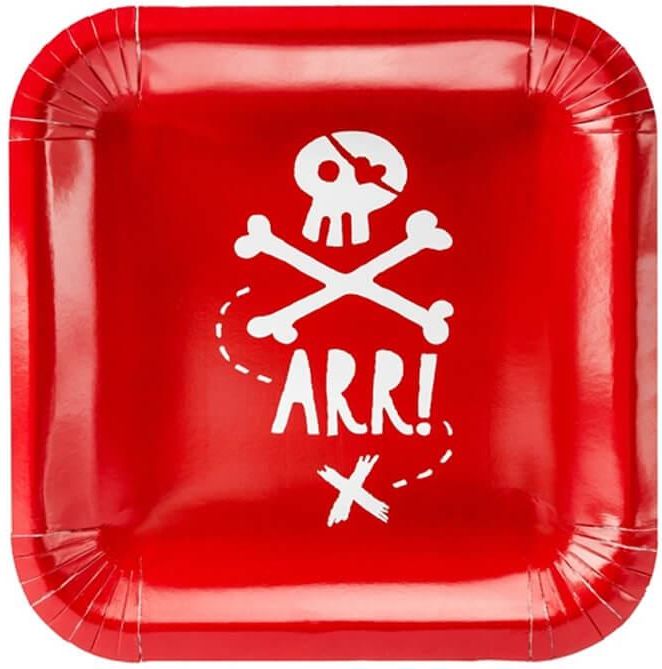 Przyjęcie zorganizowane w pirackim temacie wywoła zachwyt zarówno u solenizanta, jak i przybyłych gości. Czerwone talerzyki papierowe z białym nadrukiem sprawdzą się podczas posiłków, gdyż przeznaczone są do ciepłych jak i zimnych dań. Jednorazowe naczynia pozwolą uniknąć stłuczeń oraz zapewnią szybkie, komfortowe sprzątanie po przyjęciu.Talerzyki w połączeniu z innymi, pirackimi akcesoriami stworzą piękną imprezę. Wymiary talerzyka: 20x20 cm Opakowanie zawiera: 6 szt.