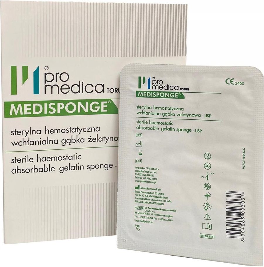 Opatrunek żelatynowy MEDISPONGE Rozmiar: 80x50x10mm Jałowa, chłonna, gąbka żelatynowa, nierozpuszczalna w wodzie, posiadająca działanie hemostatyczne. Gąbka MEDISPONGE wytwarzana jest z oczyszczonej piany żelatynowej, o jednorodnej porowatości i neutralnym charakterze. Wskazania: miejscowo podczas zabiegów operacyjnych, którym towarzyszy krwawienie żylne i włośniczkowe w sytuacjach gdy tradycyjne metody tamowania krwawienia są trudne lub niemożliwe do zastosowania, a użycie niewchłanialnych środków hemostatycznych jest niewskazane Sposób stosowania: Medisponge może być stosowany w formie suchej lub po zanurzeniu w soli fizjologicznej. Medisponge należy przycisnąć w miejscu krwawienia. Gąbka może pozostać w ranie (po zastosowaniu wszelkich zasad aseptyki), którą można zamknąć, ponieważ gąbka rozkłada się całkowicie w ciągu kilku tygodni. Medisponge nie wywołuje żadnych szkodliwych reakcji tkanek ani żadnych reakcji nadwrażliwości. Zaletą gąbki Medisponge jest możliwość zastosowania jej równocześnie z antybiotykami, chemioterapeutykami lub trombiną bez niekorzystnego wpływu na działanie hemostatyczne gąbki.