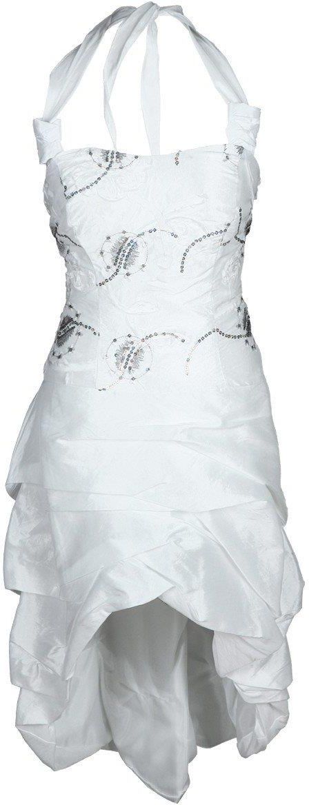 Fason: bombka, odcięta w pasie Dekolt przód: sercowe karo Plecy: odkryte częściowo Zapięcie: sznurowanie z tyłu Materiał: tkanina - tafta, podszewka Długość całkowita: mini Rękaw: szerokie ramiączka Ozdoby: cekiny, haft