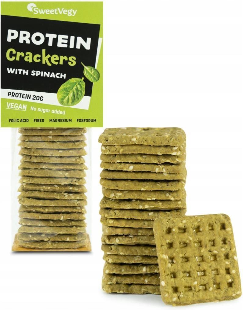 Składniki: mąka orkiszowa, szpinak 16%, olej rzepakowy, sezam, białko ryżowe, płatki jęczmienne, przyprawy, sól morska, słód jęczmienny, drożdże Proteinowe krakersy ze szpinakiem Krakersy orkiszowe z dodatkiem białka bez dodatku cukru od SweetVegy to ciastka z dodatkiem szpinaku, sezamu i przypraw. …