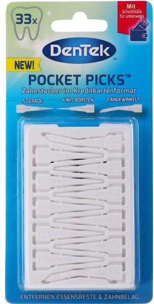 DENTEK Pocket Picks wykałaczki 33 szt. Wykałaczki Pocket Picks idealnie usuwają resztki pokarmu i płytkę nazębną. Pasują do każdego portfela, można je higienicznie przechowywać dzięki załączonemu etui. Każdy listek Pocket Picks zawiera: 5 prostych wykałaczek, 4 wykałaczki z włoskami i 2 zakrzywione …