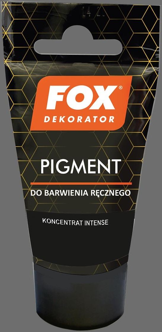 PIGMENT DEKORATOR KONCENTRAT 28 Czarny diament✔ OPIS I PRZEZNACZENIE Pigment Fox to produkt stworzony do nadawania koloru różnym powłokom dekoracyjnym, takim jak farby, tynki czy lakiery. Dostępny jest w formie tubki o pojemności 40 ml. Aplikuje się go na barwiony produkt, a następnie dokładnie mieszając uzyskuje się pożądany kolor. Intensywność koloru reguluje się przez ilość użytych tubek pigmentu. Na opakowaniu pigmentu Fox znajdują się przybliżone wzory kolorów, które ułatwiają wybór odpowiedniego odcienia. Produkt ten pozwala na kreatywne dostosowanie wykończenia powierzchni, nadając jej estetyczny i indywidualny charakter. Dlaczego Fox Dekorator? Żywe kolory Doskonała jakość Uniwersalne zastosowanie KOLOR JEST CZYSTO POGLĄDOWY I ZALEŻY OD ILOŚCI ZASTOWANEGO PIGMENTU ORAZ TYPU PRODUKTU Jak stosować? Tubkę PIGMENTU o pojemności 40 ml należy zaaplikować do barwionego produktu i dokładnie wymieszać. W zależności od intensywności koloru należy użyć odpowiednią ilość tubek. Przybliżone wzory wybarwień są dostępne na tubce PIGMENTU.