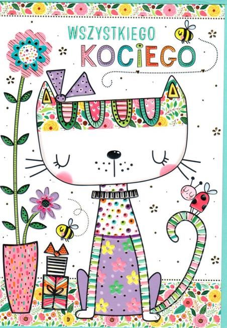 Wybierasz się na urodziny? A może zamierzasz złożyć komuś życzenia w formie listu? Śliczna kartka okolicznościowa zdecydowanie Ci się przyda! Na kartce widać wiele kolorowych kwiatów, uroczego kota oraz napis "WSZYSTKIEGO KOCIEGO".&#9989 Wewnątrz kartki znajduje się dostatecznie wolnego miejsca, by …
