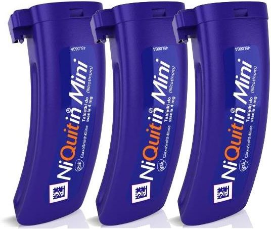 Nazwa: NiQuitin Mini Postać: tabl.do ssania Dawka: 4 mg Opakowanie: 60 tabl. Skład: 1 tabletka do ssania zawiera 4 mg nikotyny (w postaci nikotyny z kationitem) Pełny wykaz substancji pomocniczych, patrz punkt 6.1. Wskazania: Tabletki do ssania NiQuitin MINI są wskazane do leczenia uzależnienia od tytoniu poprzez łagodzenie objawów wynikających z odstawienia nikotyny, w tym uczucia głodu nikotynowego, podczas próby rzucenia palenia (patrz punkt 5.1). Końcowym celem terapii jest trwałe zaprzestanie palenia tytoniu. Jeżeli to możliwe, podczas rzucania palenia, tabletki do ssania NiQuitin MINI należy stosować jednocześnie z psychologicznym programem wspierającym rzucenie palenia. Przeciwwskazania: Nie należy stosować tabletek NiQuitin MINI: • w razie nadwrażliwości na nikotynę lub którąkolwiek substancję pomocniczą preparatu, • u dzieci i młodzieży w wieku poniżej 12 lat, • u osób niepalących. Działania niepożądane: Nikotynowa terapia zastępcza może wywołać objawy niepożądane podobne do tych związanych z podaniem nikotyny inną drogą, włącznie z paleniem tytoniu. Objawy te mogą być związane z farmakologicznym oddziaływaniem nikotyny, które jest zależne od dawki. Przy zalecanym dawkowaniu tabletek NiQuitin MINI nie stwierdzono występowania ciężkich działań niepożądanych. Nadmierne spożycie tabletek NiQuitin MINI przez osoby nieprzyzwyczajone do wdychania dymu tytoniowego może prawdopodobnie wywołać nudności, omdlenia lub ból głowy. Niektóre ze zgłoszonych objawów, takie jak: depresja, drażliwość, niepokój, wzmożony apetyt i bezsenność mogą być związane z objawami odstawiennymi w związku z rzuceniem palenia tytoniu. Osoby zaprzestające palenia tytoniu niezależnie od wybranej metody mogą spodziewać się wystąpienia dolegliwości, takich jak ból głowy, zawroty głowy, nasilony kaszel lub przeziębienie. Zaburzenia układu immunologicznego Bardzo rzadko: reakcje anafilaktyczne Zaburzenia psychiczne Często (od ≥1/100 do < 1/10): drażliwość, niepokój, zaburzenia snu, w tym koszmary senne i bezsenność Niezbyt często (od ≥1/1000 do < 1/100): nerwowość, depresja Zaburzenia układu nerwowego Często (od ≥1/100 do < 1/10): ból głowy, zawroty głowy Zaburzenia serca Niezbyt często (od ≥1/1000 do < 1/100): kołatanie serca, tachykardia Zaburzenia układu oddechowego, klatki piersiowej i śródpiersia Często (od ≥1/100 do < 1/10): kaszel, ból gardła Zaburzenia żołądka i jelit Bardzo często (od ≥1/10): nudności, podrażnienie ust, gardła i języka Często (od ≥1/100 do < 1/10): wymioty, biegunka, uczucie dyskomfortu, wzdęcia z oddawaniem wiatrów, czkawka, zgaga, niestrawność Zaburzenia skóry i tkanki podskórnej Niezbyt często (od ≥1/1000 do < 1/100): pokrzywka Dolegliwości ogólne i stany w miejscu podania Niezbyt często (od ≥1/1000 do < 1/100): zmęczenie, złe samopoczucie, ból w klatce piersiowej Interakcje: Podczas stosowania nikotynowej terapii zastępczej jednocześnie z innymi lekami żadne interakcje o znaczeniu klinicznym nie zostały ostatecznie ustalone. Nikotyna prawdopodobnie może nasilać hemodynamiczne działanie adenozyny. Dawkowanie: Wybór mocy preparatu jest uzależniony od nawyków palacza. Tabletki do ssania NiQuitin MINI 4 mg są wskazane dla osób, które wypalają ponad 20 papierosów dziennie. Jedną tabletkę umieścić w jamie ustnej i pozostawić do rozpuszczenia. Od czasu do czasu należy ją przemieszczać z jednej strony jamy ustnej na drugą, dopóki całkowicie się nie rozpuści (około 10 minut). Tabletek nie należy żuć ani połykać w całości. Podczas ssania tabletek nie należy nic jeść ani pić. Zastosowanie porad i zaleceń zawartych w psychologicznym programie zazwyczaj zwiększa szansę na sukces. Dorośli Podczas leczenia tabletkami NiQuitin MINI pacjenci powinni starać się całkowicie zaprzestać palenia tytoniu. Należy przyjmować tabletki, kiedy tylko odczuwa się potrzebę zapalenia papierosa. Zalecane jest stosowanie zazwyczaj 8-12 tabletek na dobę. Nie należy stosować więcej niż 15 tabletek na dobę. Należy stosować lek przez okres 6 tygodni, aby przełamać nawyk palenia, a następnie stopniowo ograniczać ilość przyjmowanych tabletek. Leczenie należy przerwać, kiedy dzienne spożycie wynosi 1-2 tabletki. Aby móc powstrzymać się od palenia po zakończeniu kuracji, tabletki można stosować kiedy pojawia się silna ochota na zapalenie papierosa. Pacjenci stosujący lek dłużej niż 9 miesięcy powinni skonsultować się z lekarzem lub farmaceutą. Dzieci i młodzież: Lek może być stosowany przez młodzież w wieku 12-17 lat jedynie ze wskazania lekarza lub farmaceuty. Nie zaleca się podawania leku dzieciom w wieku poniżej 12 lat ze względu na brak danych dotyczących bezpieczeństwa i skuteczności leku w tej grupie wiekowej. Środki ostrożności: W większości przypadków ogólnie znane skutki palenia tytoniu w znaczącym stopniu przeważają nad ryzykiem związanym ze stosowaniem nikotynowej terapii zastępczej. Osobom uzależnionym od palenia tytoniu, które niedawno przebyły zawał mięśnia sercowego, chorującym na niestabilną lub nasilającą się dławicę piersiową, włącznie z anginą Prinzmetala, ciężkie zaburzenia rytmu, niekontrolowane nadciśnienie, lub które niedawno przebyły incydenty naczyniowo-mózgowe, zaleca się zaprzestanie palenia bez użycia środków farmakologicznych (np. korzystając z porad psychologicznych). Jeżeli jednak pacjent nie rzuci palenia, można rozważyć zastosowanie tabletek do ssania NiQuitin MINI. Jednakże ze względu na ograniczone informacje o bezpieczeństwie stosowania leku przez tę grupę pacjentów rozpoczęcie leczenia może nastąpić jedynie pod ścisłą kontrolą lekarską. Cukrzyca. Pacjentom chorym na cukrzycę, stosującym nikotynową terapię zastępczą, należy zalecać częstsze niż zazwyczaj kontrole stężenia c