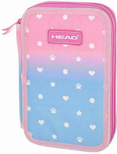 Piórnik dwukomorowy Head ombre pastel love z małymi serduszkami Dwukomorowy piórnik Head w niebiesko-różowej kolorystyce ombre przeplatanej wzorem z białych serduszek i psich łapek. Skradnie serce niejednej romantyczki. Piórnik Head nie posiada wyposażenia. Jednak dzięki pojemnym dwóm komorom …