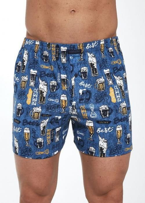 Bokserki męskie o luźnym kroju w zabawne wzory z kuflami piwa. Wygodna guma w pasie obszyta bawełną. Rozporek zapinany na guzik. Skład: 100% bawełna.