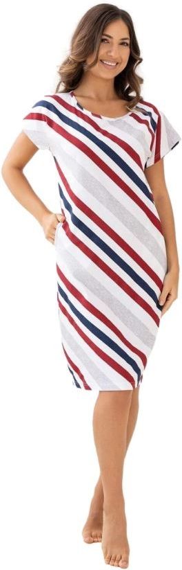 Efektowna i wygodna koszula nocna Regina, wykonana z wysokiej jakości bawełny. Fason z krótkim rękawem o długości do długości kolan. Wzór w ukośne paski, dekolt półokrągły. Po bokach wygodne kieszonki. Skład: 100% bawełna