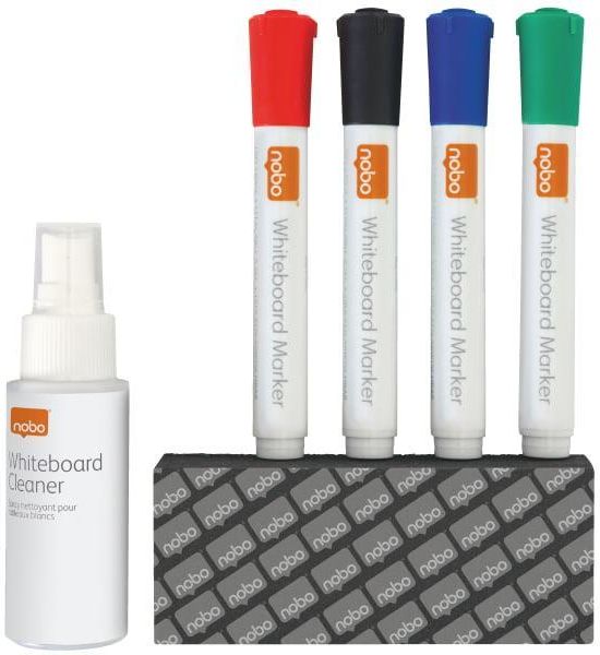 Zestaw startowy akcesoriów do tablic z 4 markerami do tablic, gumką do tablic i sprayem do czyszczenia tablic. Ten zestaw startowy akcesoriów do tablic zawiera wszystko, czego potrzebujesz, aby zacząć korzystać z tablicy suchościeralnej Nobo. Lekko pachnące markery do tablic (1 szt. czarny, 1 szt. czerwony, 1 szt. zielony i 1 szt. niebieski) do różnych zastosowań prezentacyjnych. W zestawie ściereczka do tablicy i spray do czyszczenia tablicy zapewniający idealną czystość. Zestaw startowy akcesoriów do tablic, który zawiera wszystko, czego potrzebujesz do korzystania z tablic suchościeralnych Zestaw zawiera 4 markery do tablic, 1 gumkę do ścierania i 1 spray do czyszczenia tablic. Markery do tablic: 1x czarny, 1x niebieski, 1x czerwony, 1x zielony