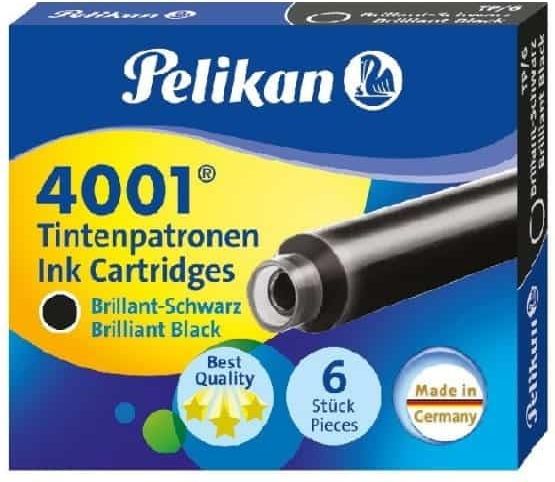 Naboje krótkie z atramentem Pelikan 4001, który został tak zaprojektowany, by chronić pióro wieczne i stalówkę zapewniając równocześnie maksymalny komfort pisania. Naboje Pelikan 4001 TP/6 przeznaczone są do piór wiecznych Pelikan na naboje jak również do piór wiecznych do nauki pisania Griffix. Atrament posiada unikalną formułę uwypuklającą wyrazistość pisanych słów. W opakowaniu znajduje się 6 sztuk krótkich naboi z atramentem w kolorze czarnym.
