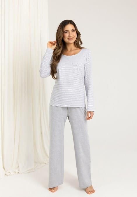 Piżama damska wykonana z wysokogatunkowej bawełny. Koszulka z długim rękawem w poziome, drobne, szare paseczki. Na wysokości piersi kieszonka. Spodnie długie, o prostym kroju, jednolite z wygodną gumką w pasie. Skład: 100% bawełna.