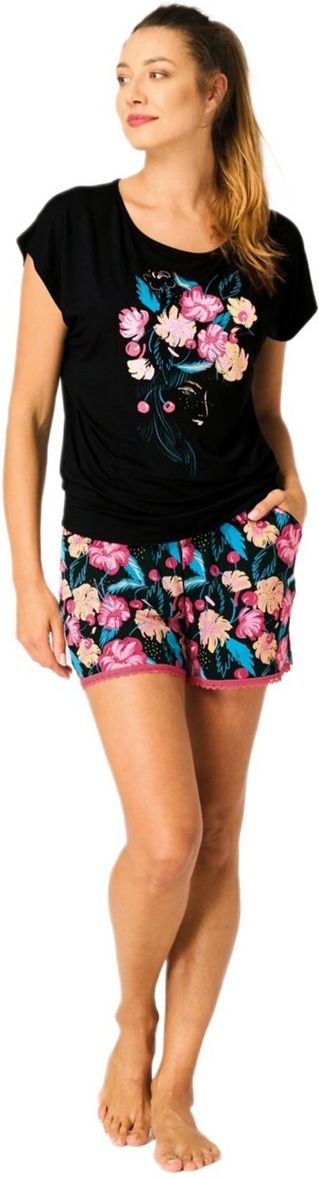 Stylowa i wygodna piżama damska w modnym, kontrastowym zestawieniu kolorystycznym. Czarna koszulka z krótkim rękawem została ozdobiona efektownym, kwiatowym nadrukiem w intensywnych odcieniach różu, beżu i turkusu, który nadaje całości wyrazistego, kobiecego charakteru. Luźny fason zapewnia komfort oraz swobodę ruchów podczas snu i relaksu. Krótkie szorty z dopasowanym, barwnym wzorem florystycznym doskonale uzupełniają górę kompletu. Elastyczny pas gwarantuje wygodne dopasowanie do sylwetki, a lekki, przewiewny materiał sprawia, że zestaw świetnie sprawdzi się w sezonie wiosenno-letnim. To propozycja dla kobiet, które cenią komfort, a jednocześnie lubią wyraziste, modne wzory. 95% Bawełna, 5% Elastan
