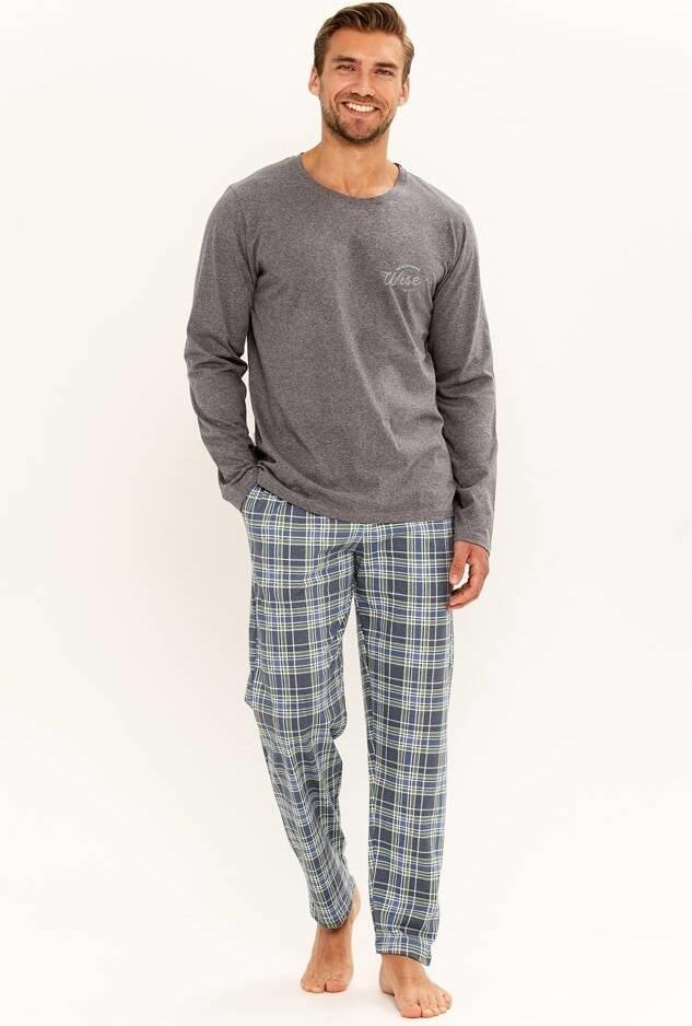 Piżama męska Taro 3296 Stuart szara [rozmiar L, Kolor szary] Piżama męska z długim rękawem i długimi spodniami. Koszulka w kolorze szarym zdobiona nadrukiem na wysokości klatki piersiowej. Spodnie w kratę z praktycznymi kieszeniami. Skład: koszulka 92% bawełna, 8% poliester, spodnie 100% bawełna 16131